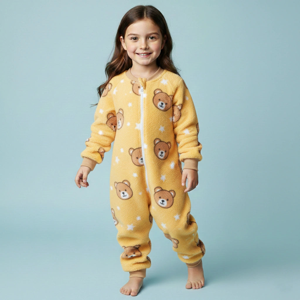 The sleeping-bag style design ensures extra comfort during chilly nights, and the smooth zip-up closure makes it easy to dress and undress your little one. Featuring a cute brown bear cartoon pattern, this pajama adds a playful touch kids love while keeping them cozy all night.